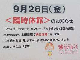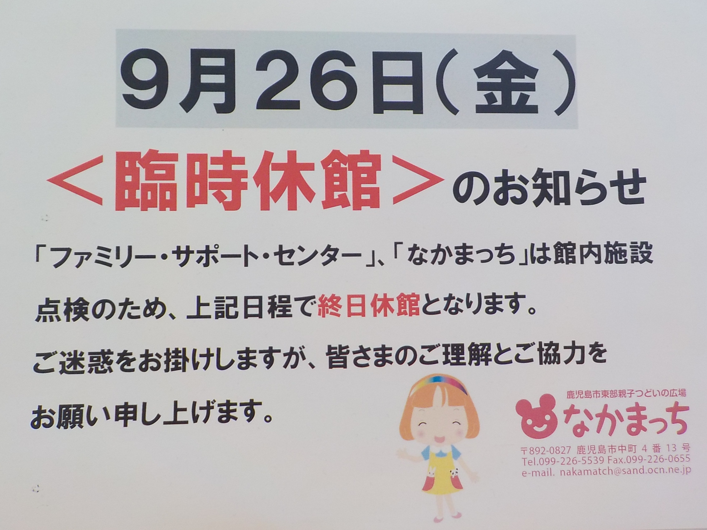 さて、9月26日(金)なかまっちは臨時休館となります。施設メンテナンスや点検等で終日お休みです。皆様には大変ご迷惑をおかけしますが、よろしくお願いします。