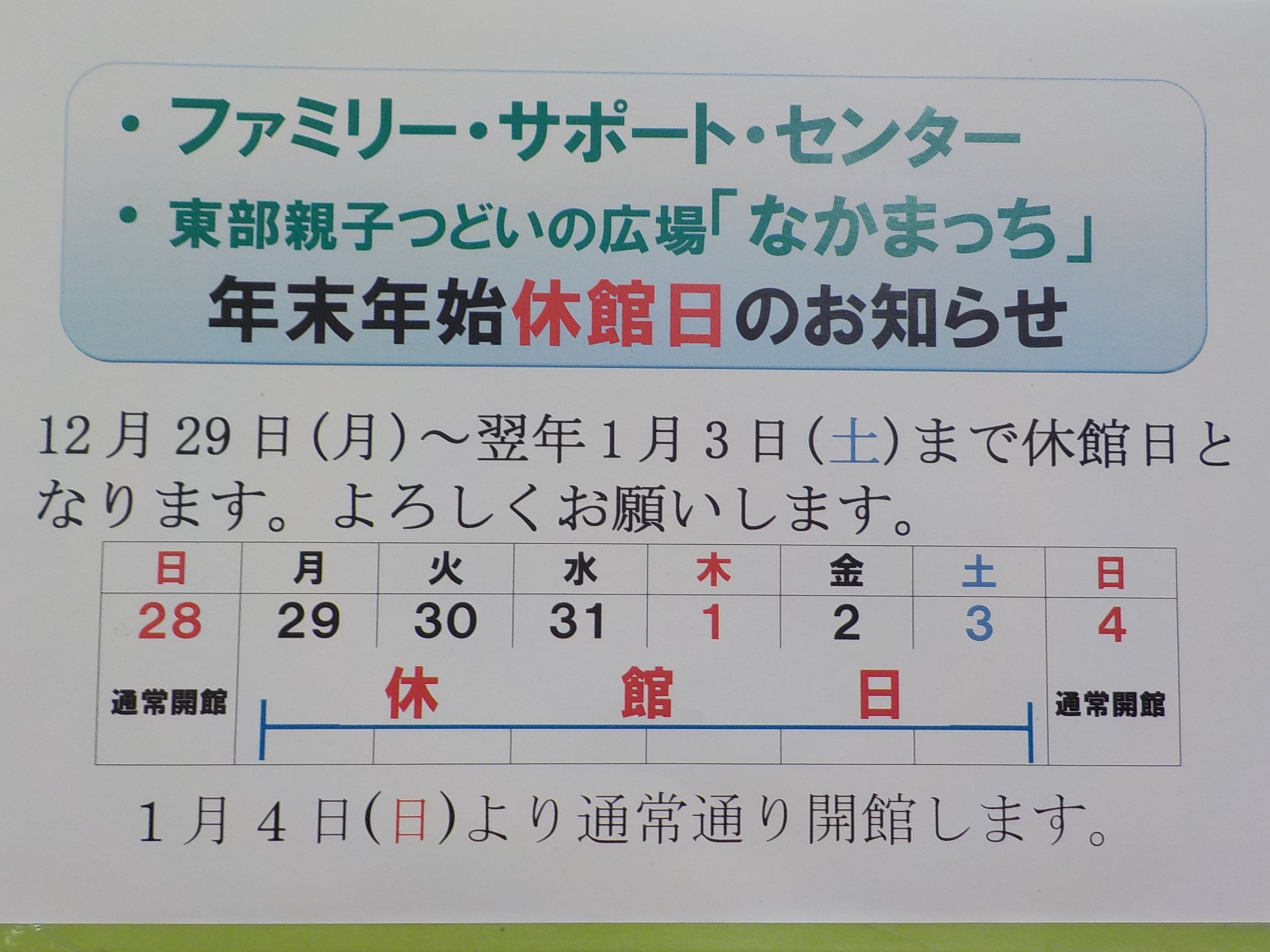 今年も残すところあとわずかですね。なかまっちは皆さまの元気な笑顔に支えられ、楽しい一年となりました。来年もすてきな年になりますように心から願っています。どうか体調に気を付けて良いお年をお迎えください。年末年始は左記の通り休館となります。年明けは1月4日(日)から開館です。どうぞよろしくお願いします。