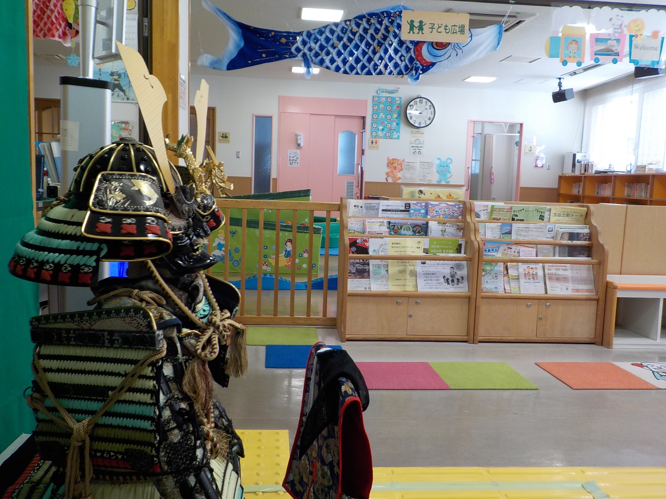 5月5はこどもの日、端午の節句です。なかまっちでは子どもたちの健やかな成長を願い、毎年エントランスに「鎧(よろい)兜(かぶと)」と「こいのぼり」を飾っています。堂々とした風格の鎧(よろい)兜(かぶと)、また室内ではあるものの4匹のこいのぼりたちが優雅に泳いでいる姿は圧巻。子どもたちはもちろん保護者の方々も嬉しそうに「手が届くかな〜」と背伸びしたり、兜の隣で写真を撮ったりする様子がとても微笑ましい今日この頃です。みなさんも是非見に来てくださいね!