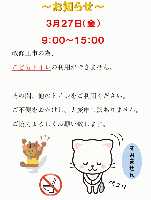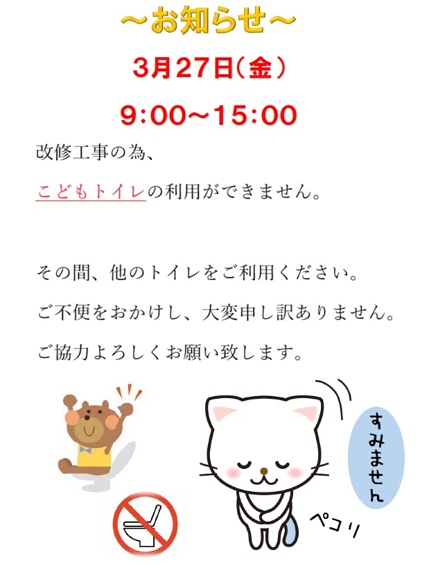 3月27日(金)9:00〜15:00「こどもトイレ改修工事」の為利用ができません。その間、他のトイレ(優先トイレ・女性用トイレ)におまるを準備してあります。そちらをご利用ください。ご不便をおかけし、大変申し訳ありません。ご協力よろしくお願い致します。